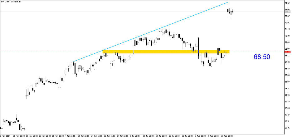 WMT (H4). Sau khi chia tách cổ phiếu vào tháng 2 năm 2024, đây là mức cao nhất mà Walmart đạt được. Chúng tôi thấy đường dự báo tăng giá rõ ràng, nhưng giá có thể quay trở lại mức trục hàng tuần quanh 68,50 trước khi tăng trở lại trên mức 70,00.